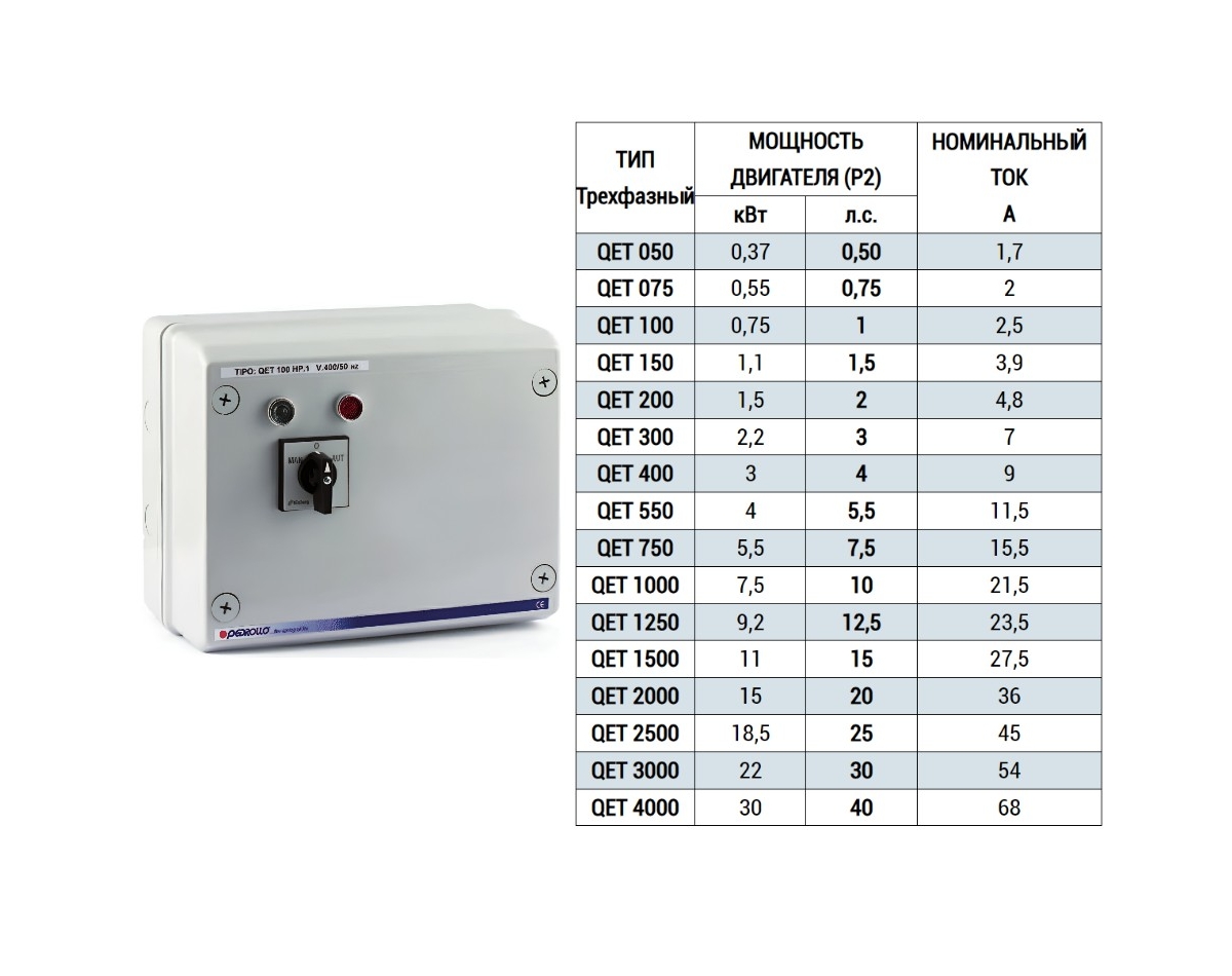 Пульт управления PEDROLLO серии QET для трехфазных насосов. Используются для автоматического включения и выключения бытовых и промышленных погружных скважинных, дренажных, фекальных и циркуляционных насосов, работающими в составе систем водоснабжения, отопления, канализационных насосных станций (КНС), для подачи и откачивания воды из резервуаров и т.д.