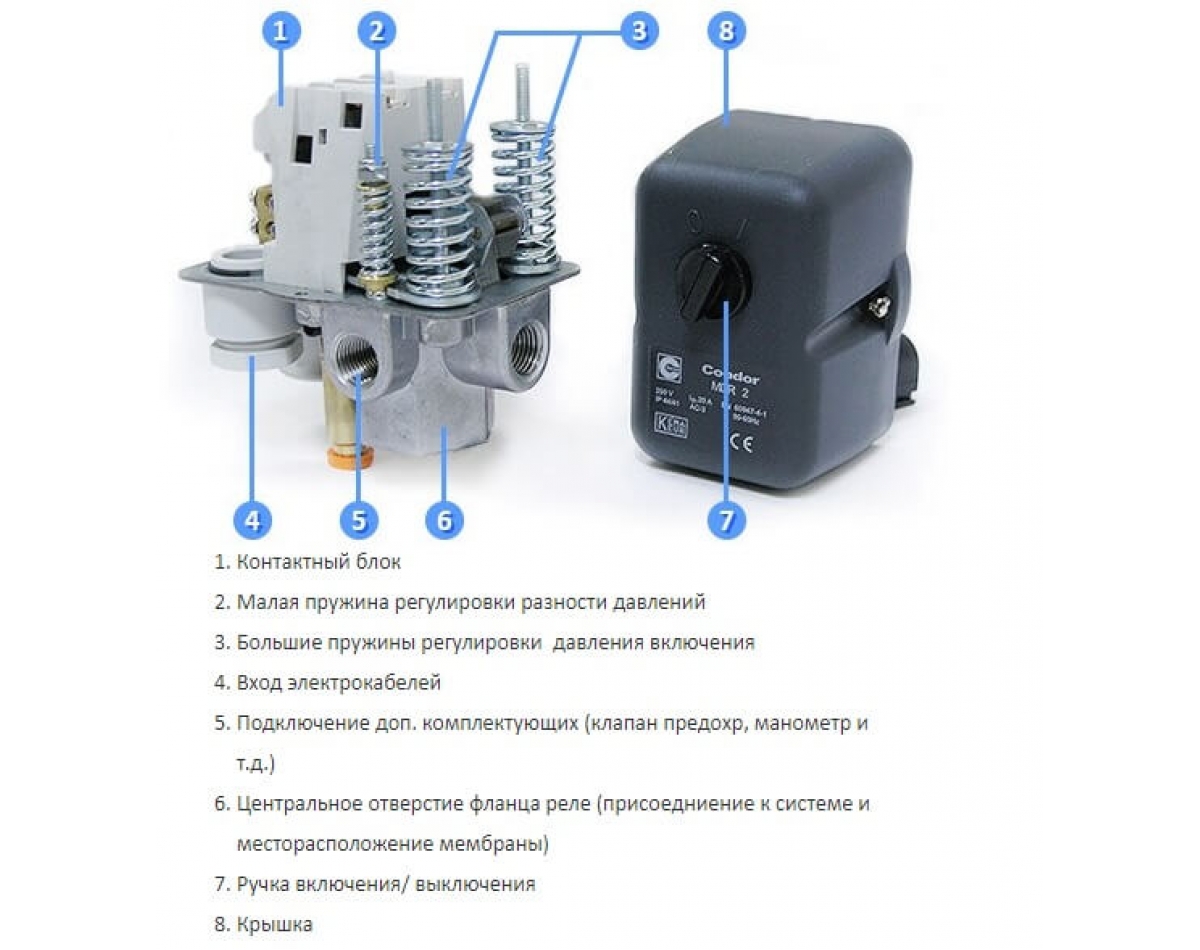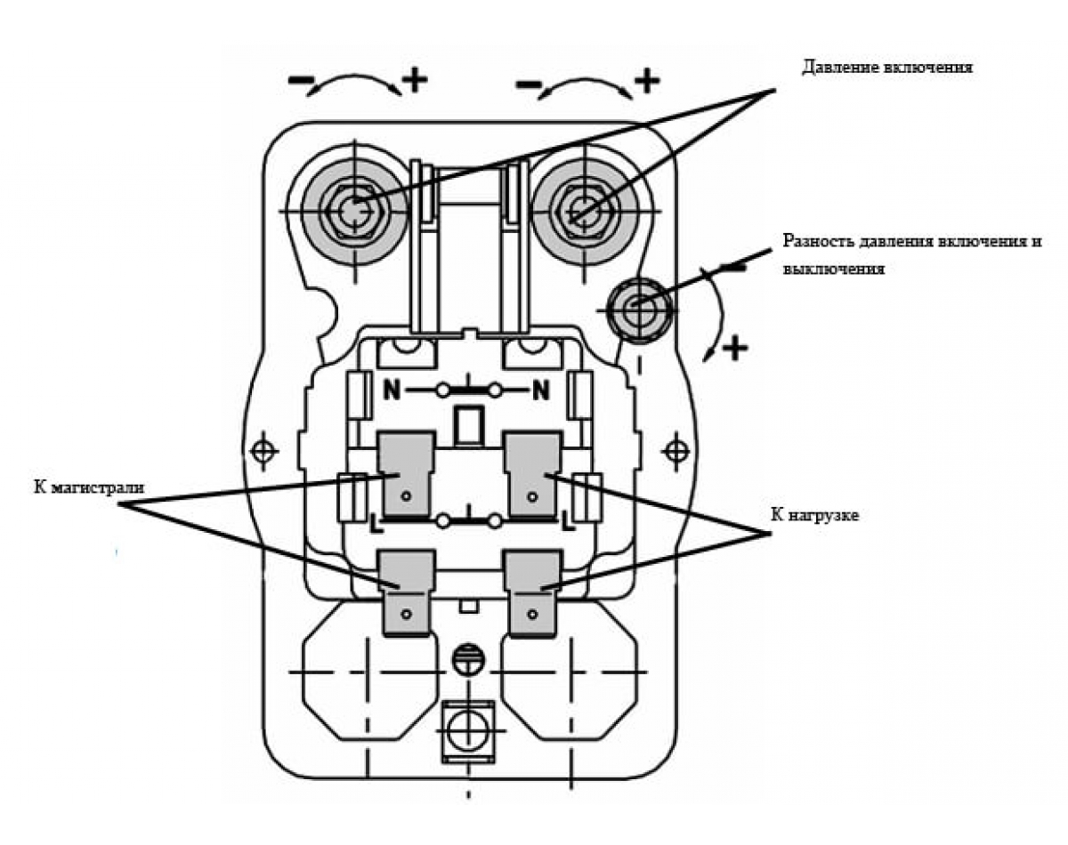 Реле давления представляет из себя блок с регулируемыми пружинами, соединенный с системой через мембрану. Сжатие и ослабление пружин под действием давления, передаваемого мембраной, приводят к замыканию контактов цепи (при минимальном давлении) и размыканию (при достижении верхнего предела давления)