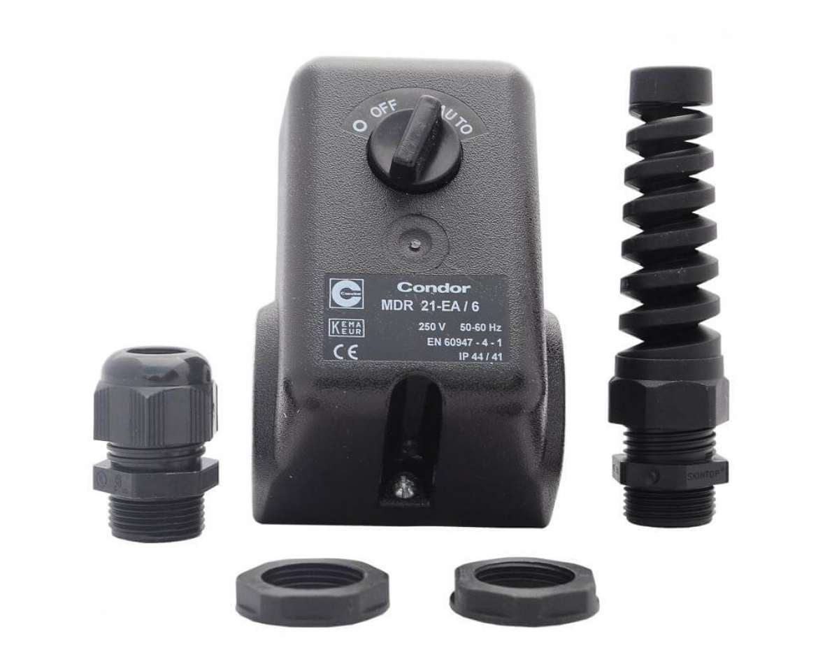 ПРЕИМУЩЕСТВА Реле давления CONDOR MDR 21/6 может использоваться с насосами мощностью до 2.2 кВт, имеет выключатель электропитания на корпусе. Подключение двух полюсное для однофазных насосов, в комплект входит 2 гермоввода для кабеля не более 12 мм. Соответствует EN60947.