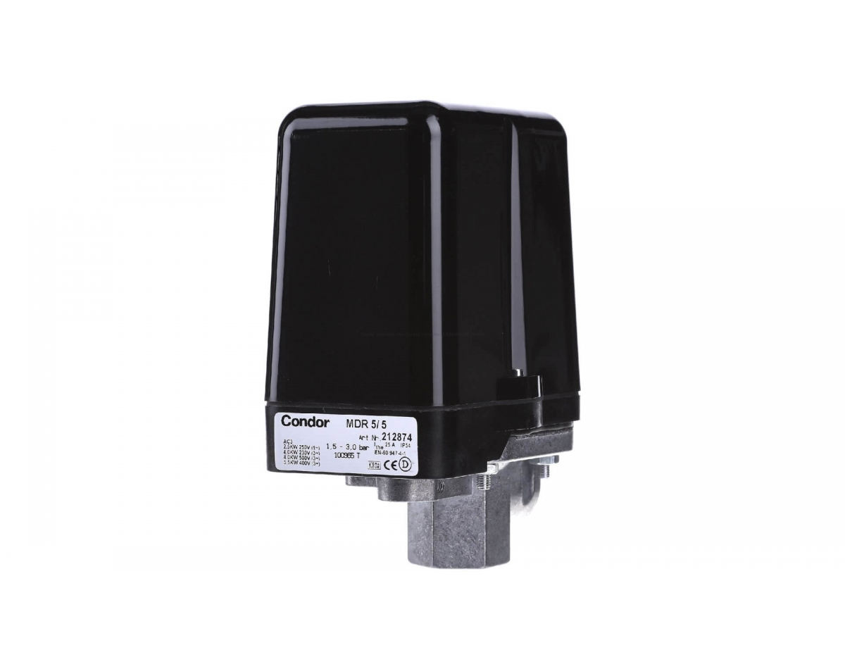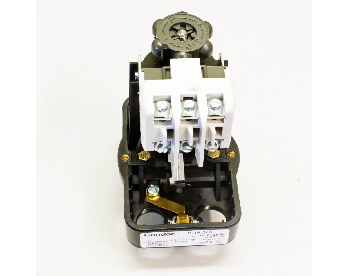 ПРЕИМУЩЕСТВА Реле давления CONDOR MDR 5-5 может использоваться с трехфазными насосами мощностью до 5.5 кВт, однофазными до 2.5 кВт. Легко регулируется с помощью регулировочного колеса расположенного под корпусом. Подключение трех-полюсное. Соответствует EN60947. На корпусе, с боку расположен выход 1/4" дюйма, под манометр или датчик сухого хода. Благодаря высокой характеристике по току реле давления можно использовать без пульта управления.