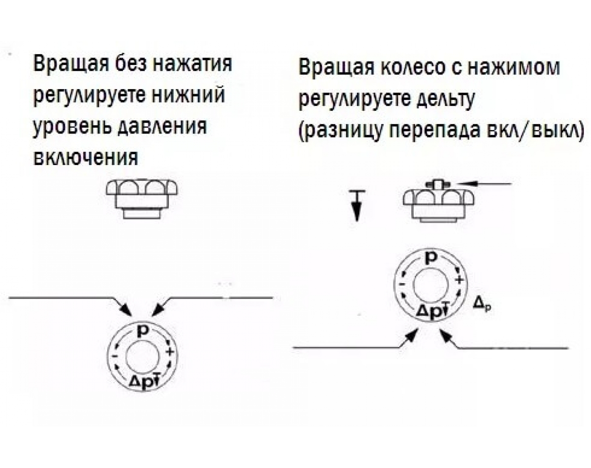 Реле давления представляет из себя блок с регулируемыми пружинами, соединенный с системой через мембрану. Сжатие и ослабление пружин под действием давления, передаваемого мембраной, приводят к замыканию контактов цепи (при минимальном давлении) и размыканию (при достижении верхнего предела давления)