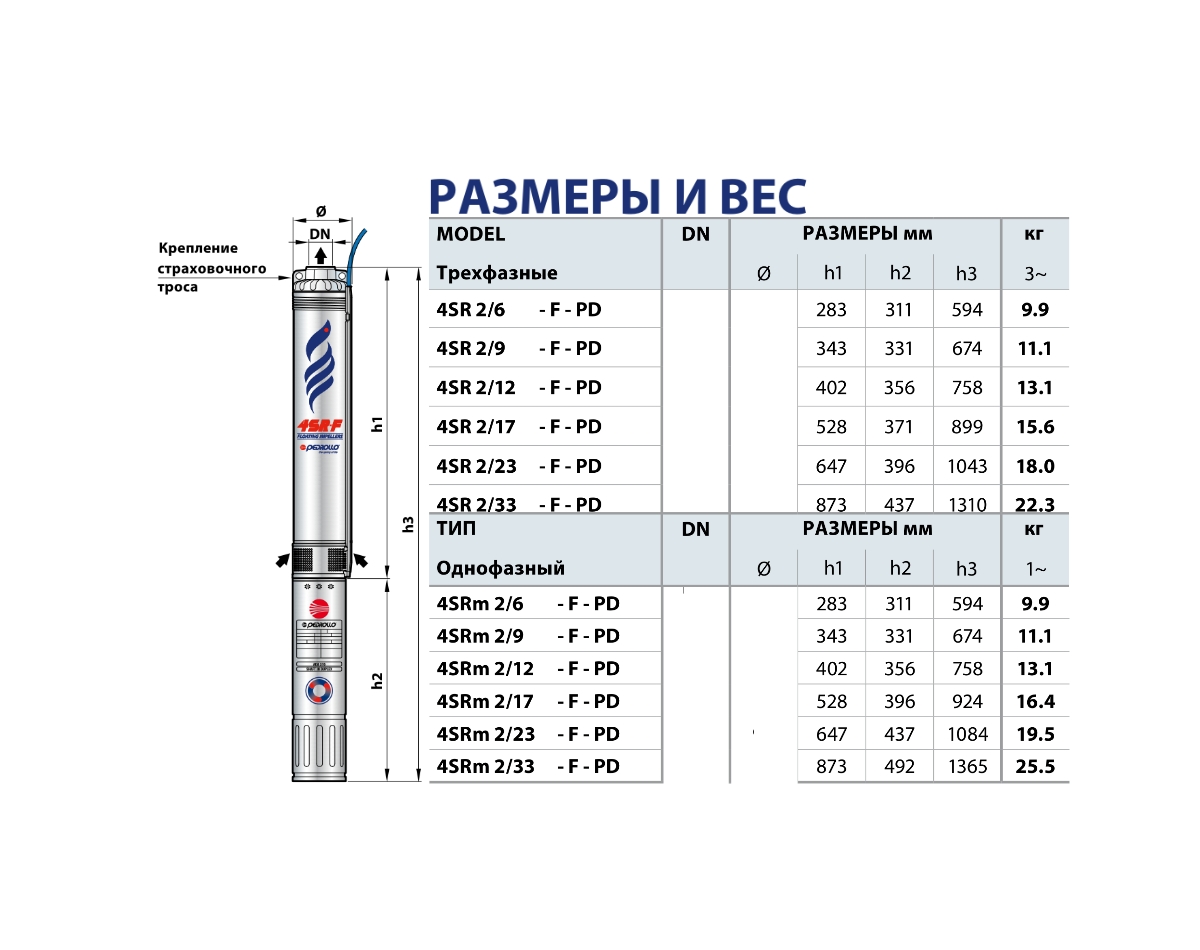 Погружные скважинные насосы 4SR производитель PEDROLLO (Италия) — предназначены для подачи чистой холодной воды (без абразивных и волокнистых включений) из скважин, глубоких колодцев и открытых водоемов.