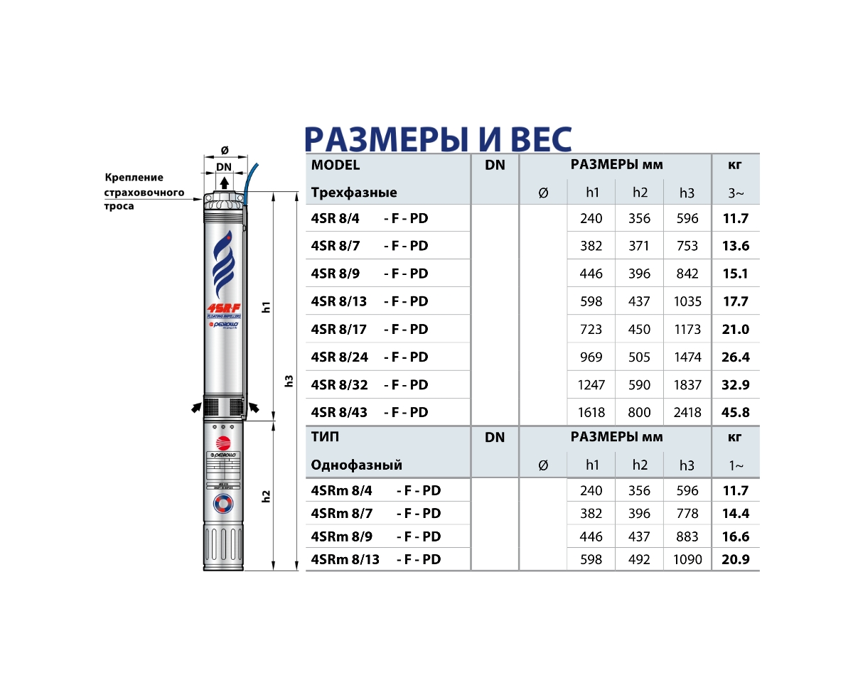 Насосы 4SR — это промышленный центробежный многоступенчатый глубинный насос, агрегатированный погружным трехфазным 400B (50 Гц) электродвигателем серии PD или PS (электродвигатель PS обладают высоким КПД). Корпус насосной части и двигателя изготовлен из нержавеющей стали AISI 304.
