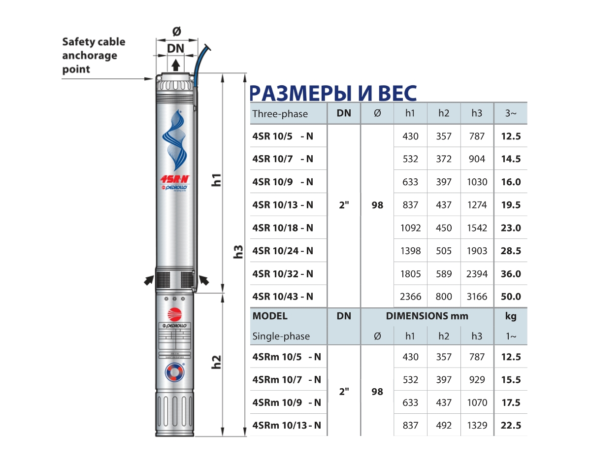 Погружные скважинные насосы 4SR производитель PEDROLLO (Италия) — предназначены для подачи чистой холодной воды (без абразивных и волокнистых включений) из скважин, глубоких колодцев и открытых водоемов.