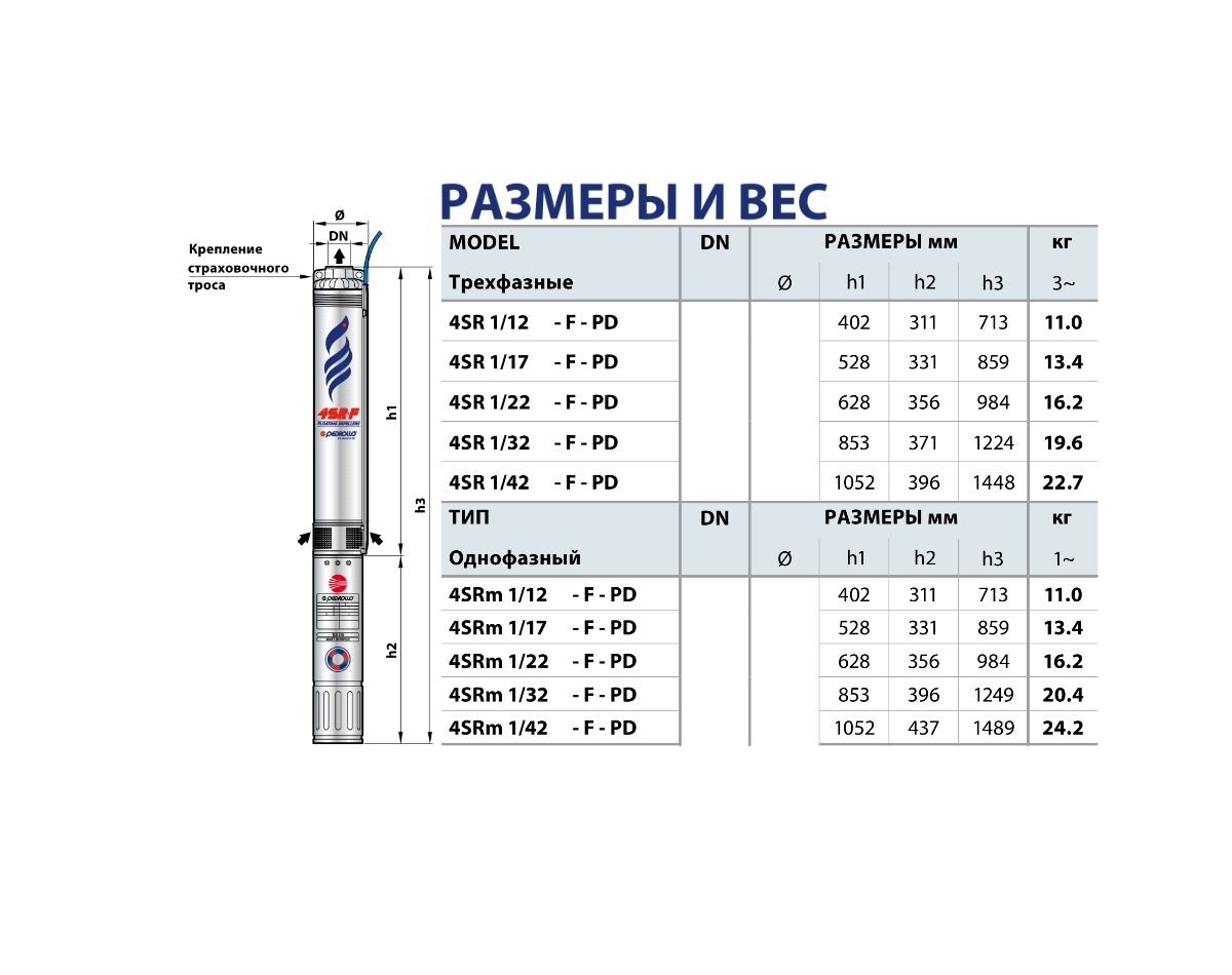 Насосы 4SR — это промышленный центробежный многоступенчатый глубинный насос, агрегатированный погружным трехфазным 400B (50 Гц) электродвигателем серии PD или PS (электродвигатель PS обладают высоким КПД). Корпус насосной части и двигателя изготовлен из нержавеющей стали AISI 304.