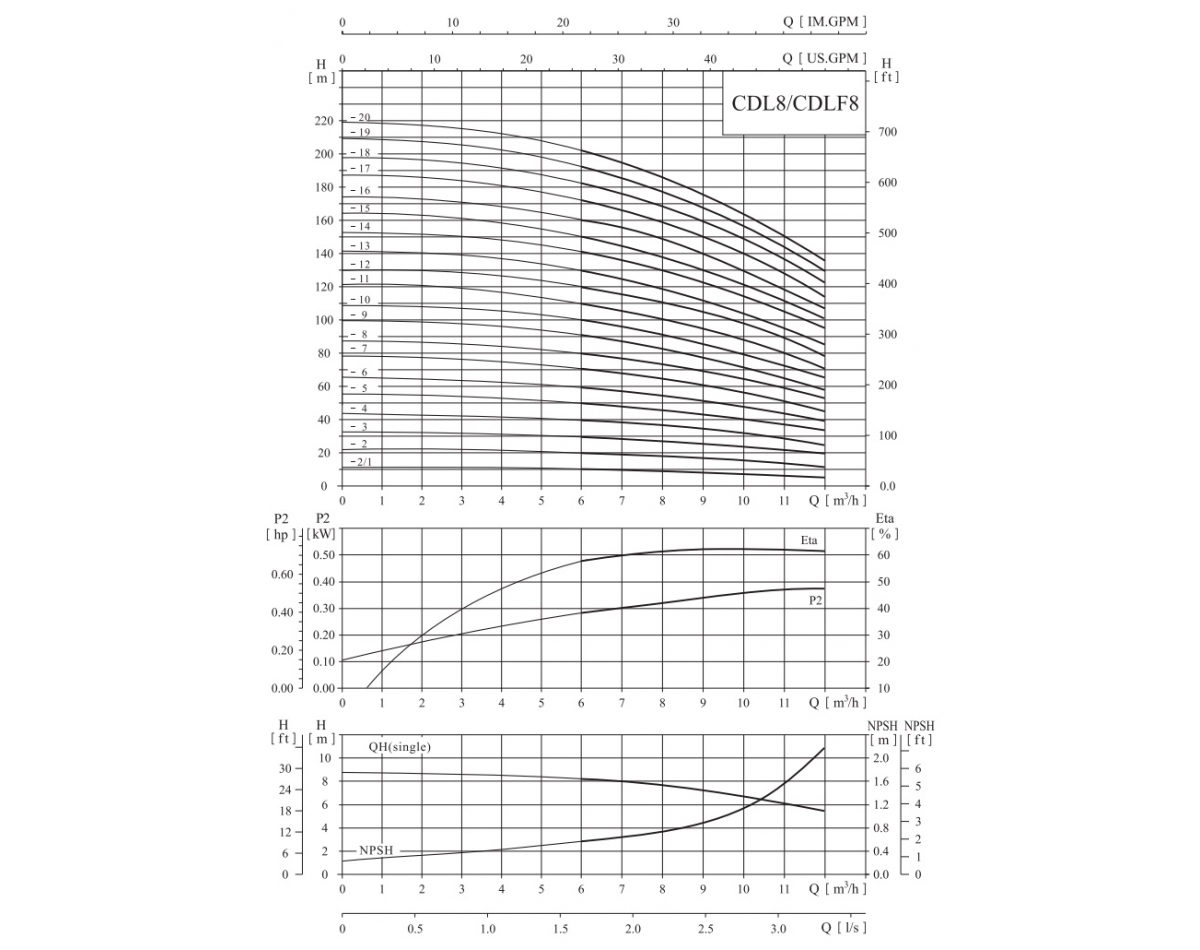 Вертикальное расположение двигателя и насосной части. Впускной и выпускной патрубки находятся на одной оси. Вал двигателя соединяется с валом насоса через муфту. Насос состоит из ступеней: рабочее колесо + диффузор из нержавеющей стали, установленных в цилиндрический корпус и соединенных при помощи стяжных болтов совместно с основанием или плитой и головной частью. Торцевое уплотнение типа картридж.