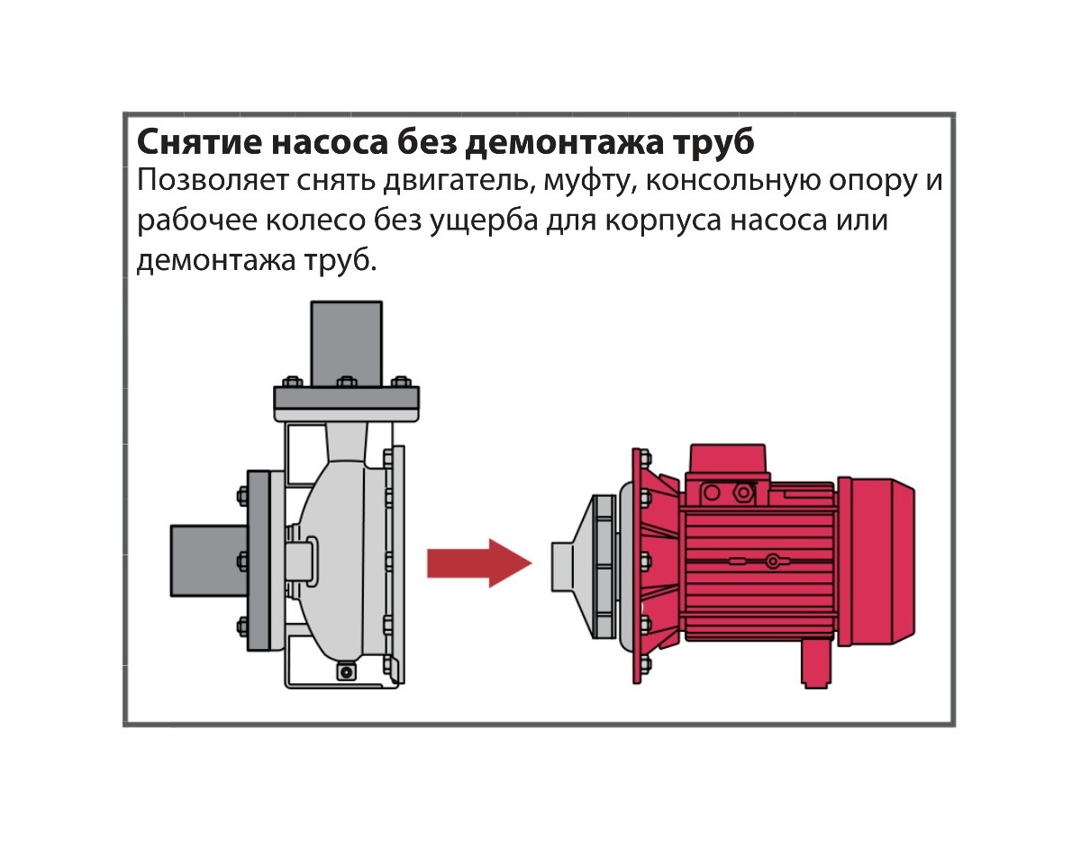 Материалы : корпус насоса, рабочее колесо, вал - нержавеющая сталь AISI 304. Возможно исполнение из нержавеющей стали AISI 316 по запросу. Конструкция консольно-моноблочного насоса позволяет производить обслуживание насоса без разбора гидролинии.
