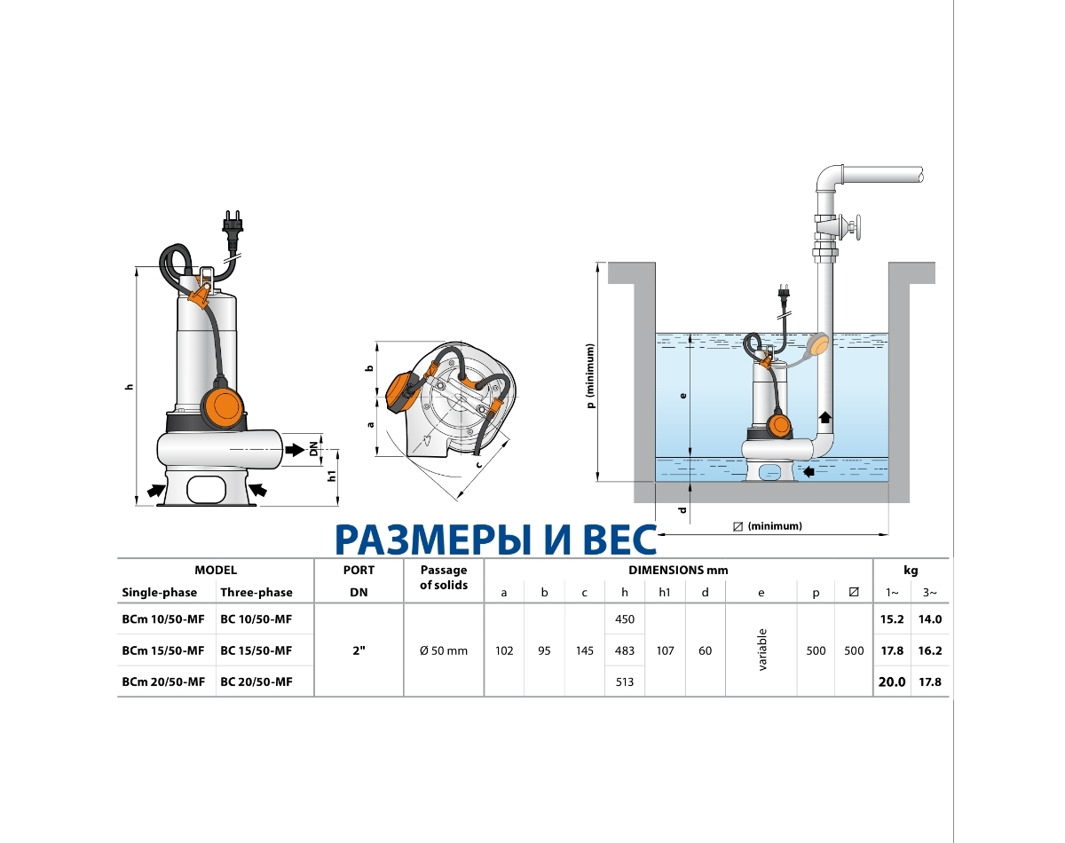 Погружные электронасосы из нержавеющей стали BC-MF рекомендуются для дренажа сточных вод в бытовом секторе, коммунальном хозяйстве и промышленности. Они оснащены ДВУХКАНАЛЬНЫМ рабочим колесом, обеспечивающим перекачивание жидкости с присуствием во взвеси коротковолокнистых твердых частиц размерами до Ø 50 мм. Насосы предназначены для отвода сточных и канализационных вод, смеси воды с илом, поверхностных и грунтовых вод на таких объектах, как дачи, коттеджи, индивидуальные жилые дома . Эти насосы отличаются надежностью работы в автоматическом режиме при использовании в стационарном варианте.