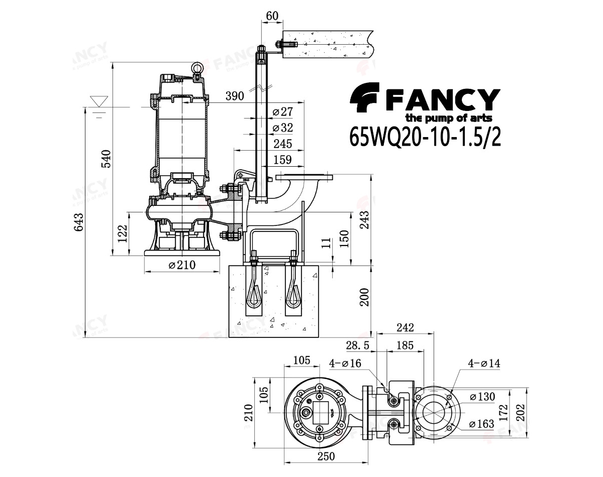 Промышленный погружной канализационный насос FANCY серии WQ используется для отвода канализационных, сточных, грунтовых, поверхностных и дренажных вод. Насос не предназначен для перекачки длинно волокнистых включений (тряпки, веревки). Стандартное исполнение насоса 3*380В, без поплавкового выключателя. Для полноценной работы насоса в автоматическом режиме рекомендуется подключение строго через защитную автоматику: шкаф управления или пульт управления насосами! Возможно исполнение насоса 1*230В со встроенным поплавковым выключателем.