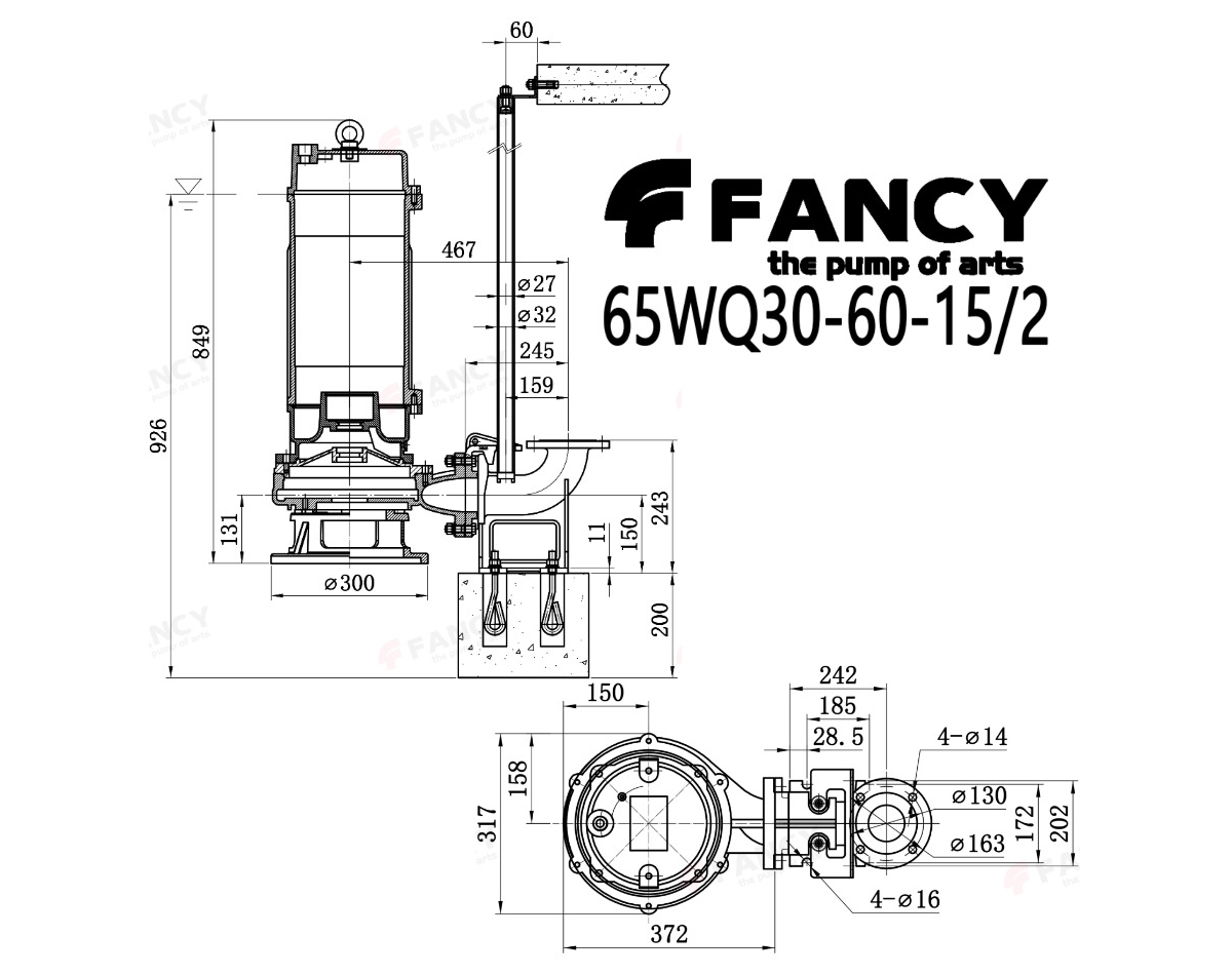 Промышленный погружной канализационный насос FANCY серии WQ используется для отвода канализационных, сточных, грунтовых, поверхностных и дренажных вод. Насос не предназначен для перекачки длинно волокнистых включений (тряпки, веревки). Стандартное исполнение насоса 3*380В, без поплавкового выключателя. Для полноценной работы насоса в автоматическом режиме рекомендуется подключение строго через защитную автоматику: шкаф управления или пульт управления насосами! Возможно исполнение насоса 1*230В со встроенным поплавковым выключателем.