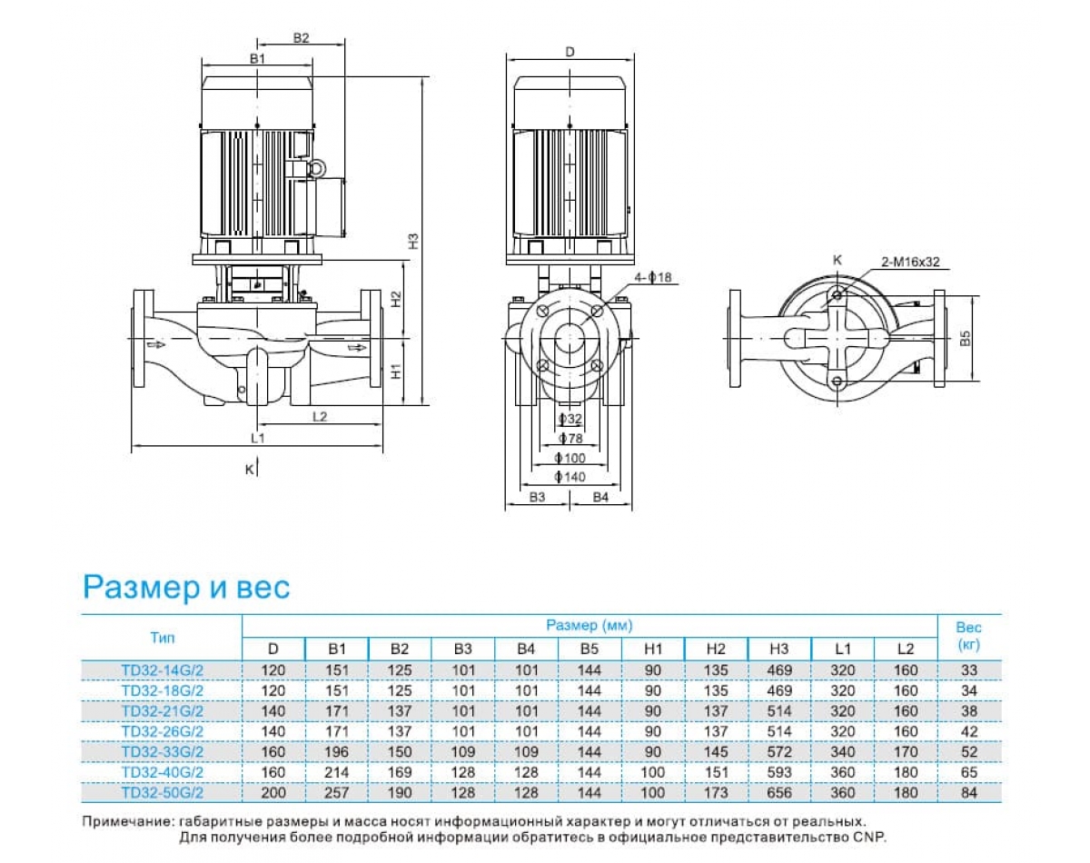 CNP серии TD это вертикальные одноступенчатые насосы типа ин-лайн центробежные, с сухим ротором, нормальным всасыванием, с патрубками в одну линию.
