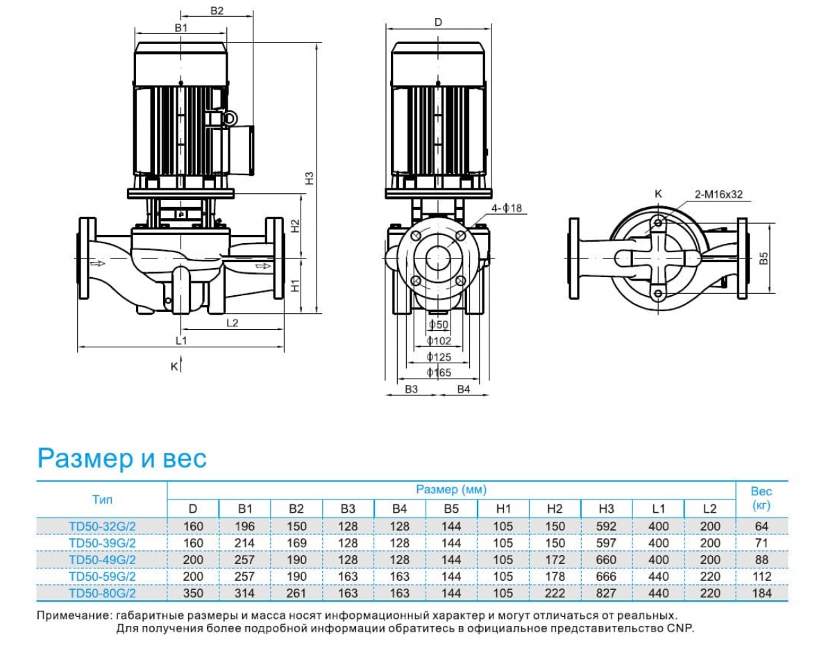CNP серии TD это вертикальные одноступенчатые насосы типа ин-лайн центробежные, с сухим ротором, нормальным всасыванием, с патрубками в одну линию.