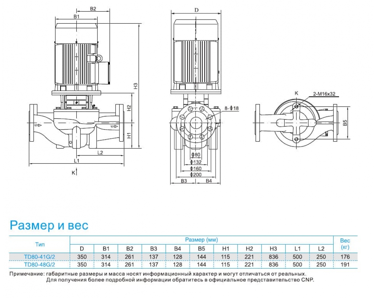 CNP серии TD это вертикальные одноступенчатые насосы типа ин-лайн центробежные, с сухим ротором, нормальным всасыванием, с патрубками в одну линию.
