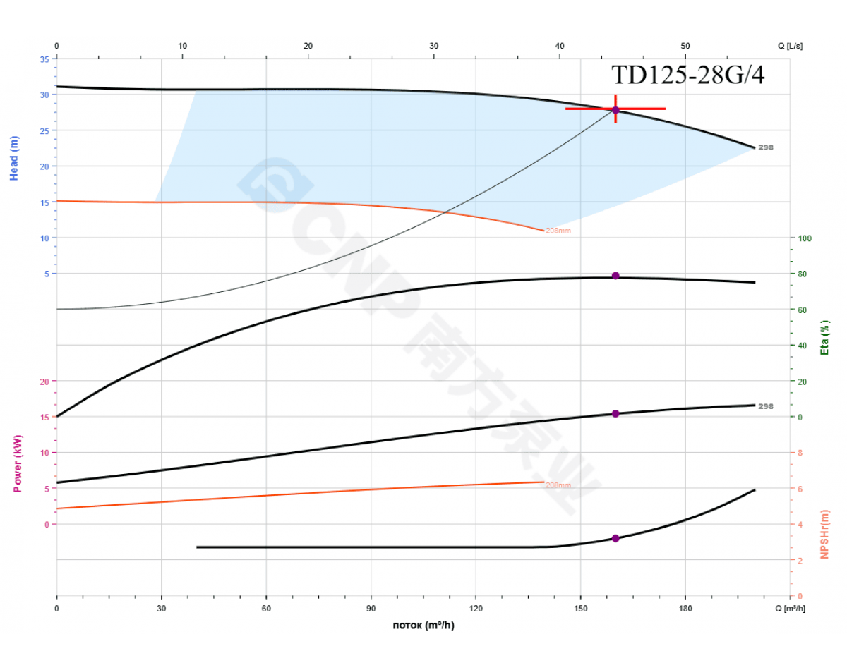 Гидравлическая часть насоса и рабочее колесо выполнено из высокопрочного чугуна, стандартное исполнение 12 бар, так же возможно исполнение 16 бар. Рабочее колесо возможно из нержавеющей стали.