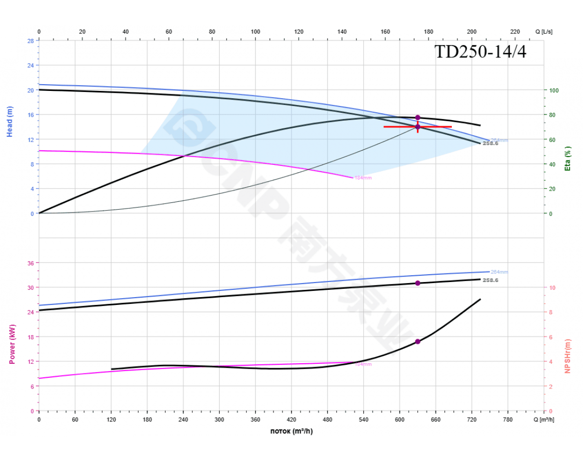 Гидравлическая часть насоса и рабочее колесо выполнено из высокопрочного чугуна, стандартное исполнение 12 бар, так же возможно исполнение 16 бар. Рабочее колесо возможно из нержавеющей стали.