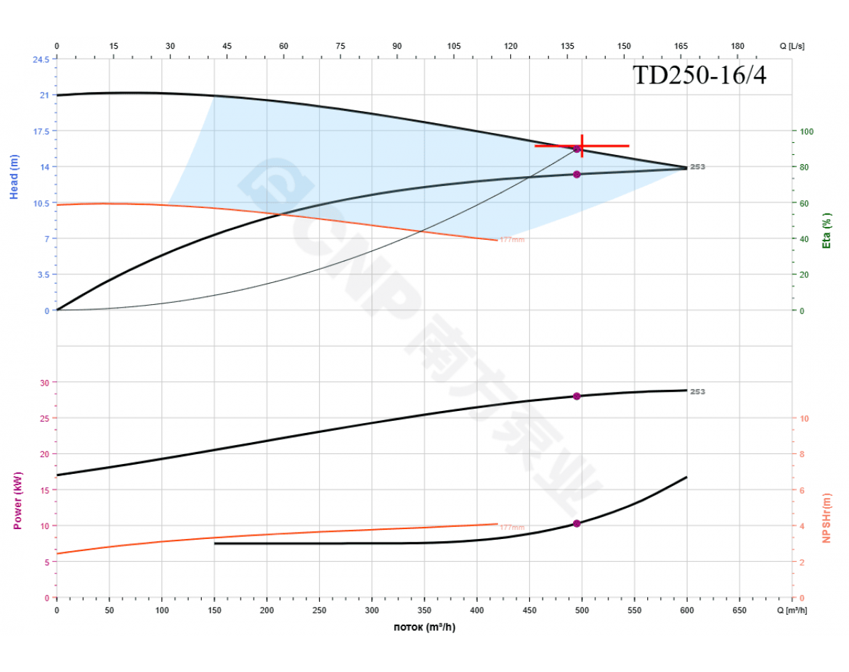 Гидравлическая часть насоса и рабочее колесо выполнено из высокопрочного чугуна, стандартное исполнение 12 бар, так же возможно исполнение 16 бар. Рабочее колесо возможно из нержавеющей стали.